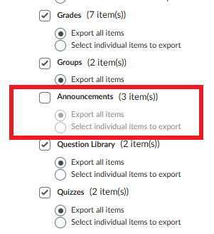 To alleviate this issue, when choosing the ‘Select Components’ option as shown above, simply uncheck the box next to Announcements. This will ensure that old course announcements will not be copied to the new course shell. Shown below: