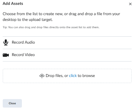 Select the Add Assets option, there you can either record video, record audio, or upload a pre-existing video file that will be placed into the Media Library.