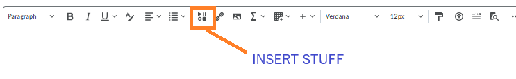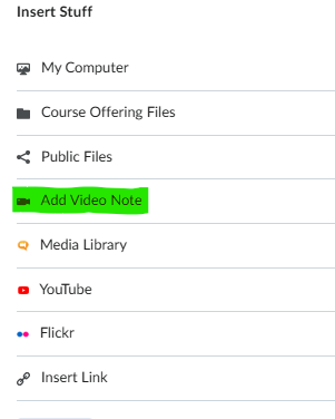Inside the text box there is an ‘INSERT STUFF’ icon as shown below. By selecting this icon the menu will show a Video Note selection, click on Video Note.