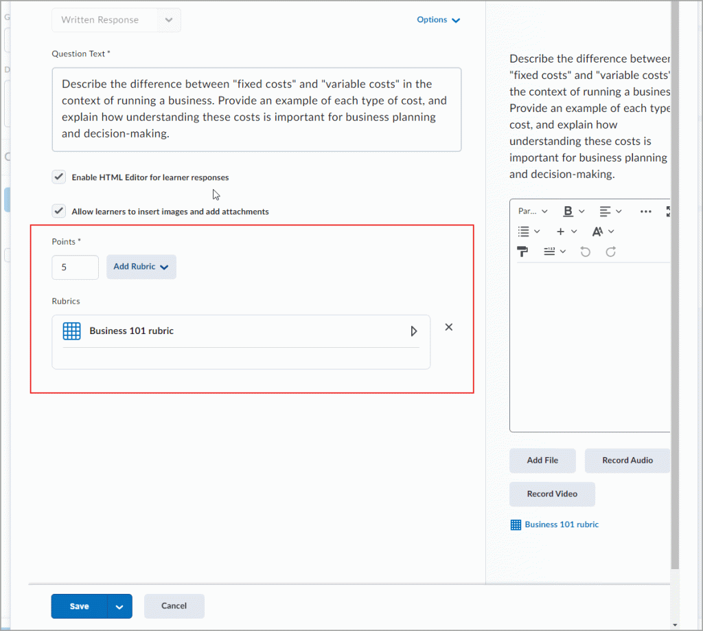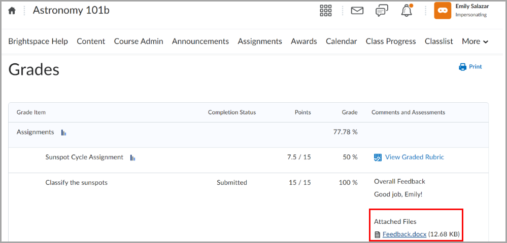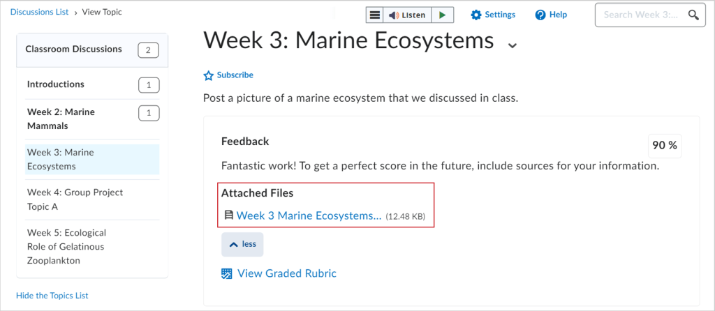 Instructors’ attached files now appear in the Attached Files section for each learner’s discussion evaluation. Learners can view attached file feedback when viewing their evaluated discussion topic.